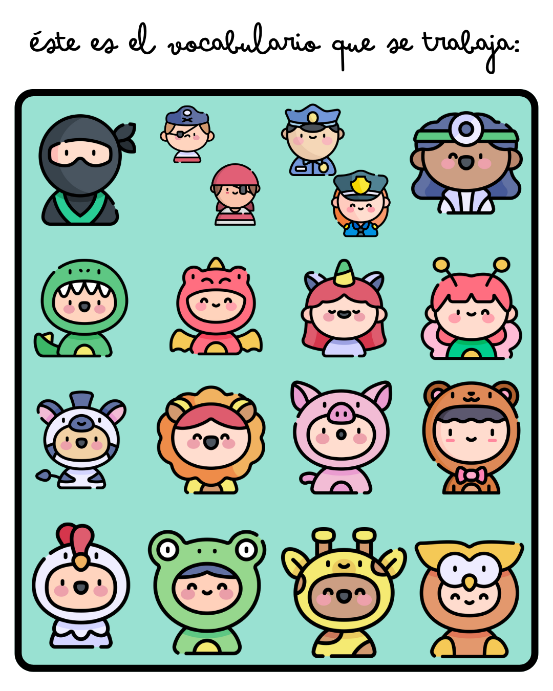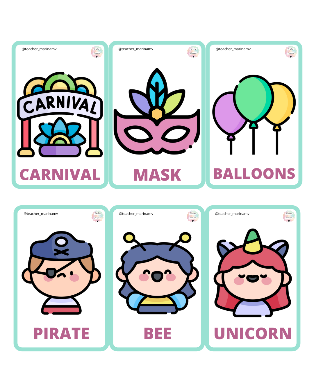 Flashcards para trabajar el vocabulario relacionado con la fiesta de carnaval y los disfraces. Recurso Digital.