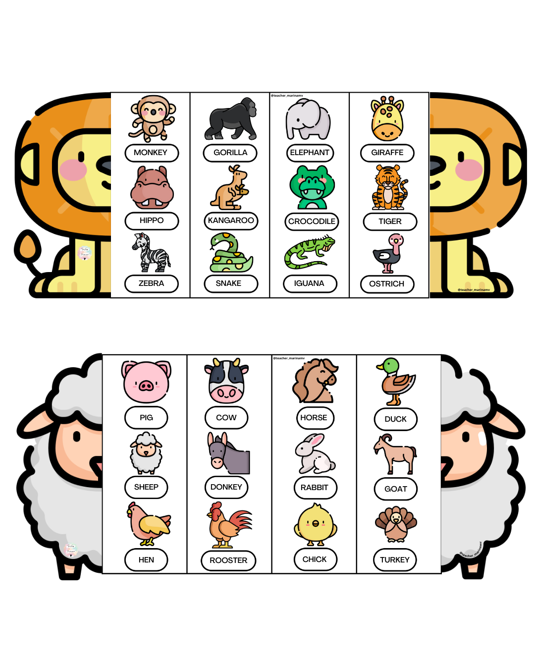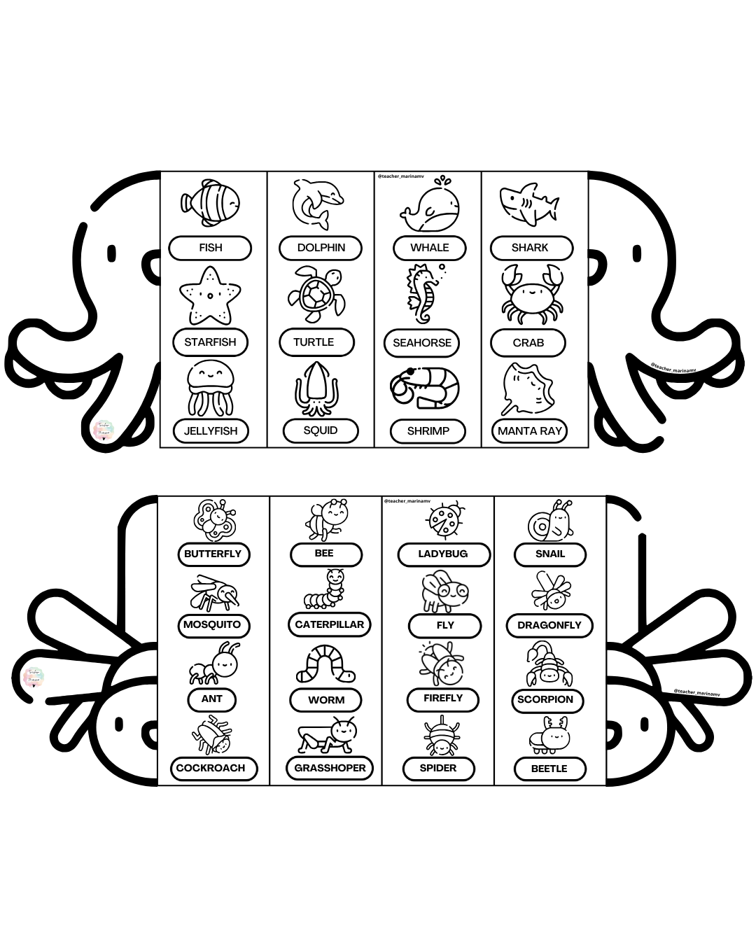 Hay 4 modelos diferentes: animales salvajes (Wild), animales de la granja (Farm), animales del mar (Sea) e insectos (Bugs). Además tienes dos opciones de cada uno, a color y en blanco y negro. Recurso Digital.